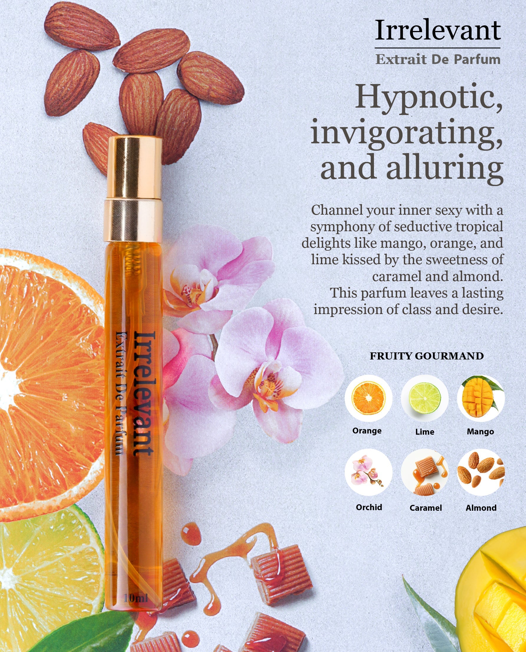 Irrelevant is a tribute to the Bahamian culture. This unisex parfum awakens your senses with sun kissed bursts of sweetened caramel, lime, mango, patchouli, and orange. Your Caribbean vacation in a bottle.