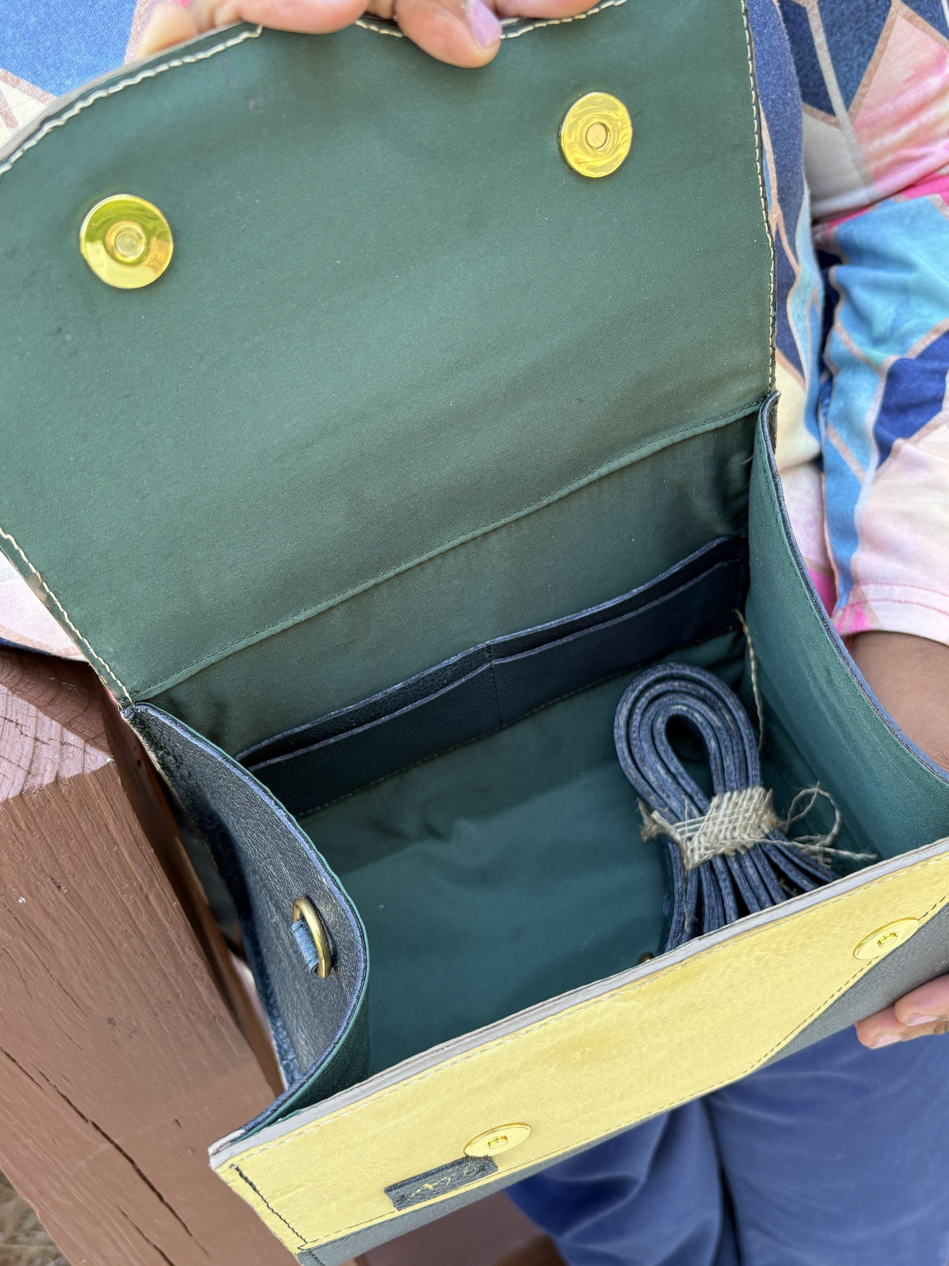 The LaMaya Handbag showcases a refined marquetry design in vibrant yellow and deep green leather, paired with a stunning fabric interior. Its spacious layout features built-in card slots for effortless organization, while the magnetic closure ensures secure access. Complete with a top handle and a detachable shoulder strap, this bag combines elegant craftsmanship with versatility for the sophisticated wearer. Handbag size: 6" H x 9" W x 4.5" D, with top handle 8" H.